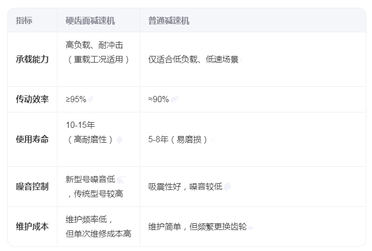硬齒麵減速機與普通減速機(通常指軟齒麵減速(sù)機)的核心區別主要體現在齒輪材料、工藝、性能及(jí)應用場景等方麵,具體差異如下: